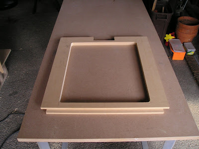 I was able to find a little bit of time over the weekend to get some more work done on the arcade cabinet. I finished making the last cuts on the bezel panel (cutting out the rectangle for the monitor). This proved to be a little more difficult than it sounds because I had no way of getting into the corners to make a perfectly square cut. I ended up eyeballing it and sanding - it came out OK but it will eventually be covered by the black posterboard bezel I'll be making to hide the monitor casing.