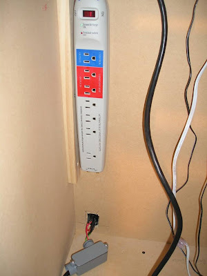 Finally, here are some shots of the inside - as you can see it's quite a mess. I mounted the Smart Strip on the inside of the cabinet - it's ready for the computer! I also used some velcro to hold the plastic box containing the wire hack against the side panel.