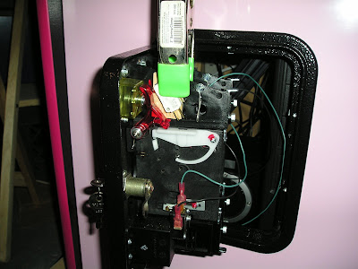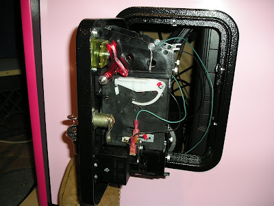 Here are a couple of "before" shots of the back of the coin door. The yellow plastic is the return button and the red plastic is what will come into contact with the microswitch I'm installing.