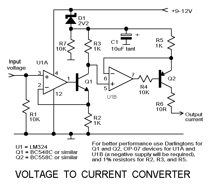A voltage signal can be converted into a variable current signal, and a circuit to do this is given in Figure 5 in the FIGURES archive. This circuit converts a positive, ground-referenced voltage into a positive current source that can be fed into one joystick position input. The relationship between input voltage and output current is linear. 1V on the input produces an output current of 1mA. The circuit requires a 9-12V supply, which is unfortunately not available on the joystick port, though you could use a switched capacitor voltage booster (e.g. the Linear Technology LT1054) or a switching supply (e.g. the Motorola MC34063 or the National Semiconductor LM2574 series) to produce a higher voltage rail from the 5V output on the joystick port, but be aware that switching power supplies can create a lot of electrical noise.